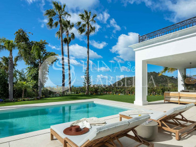 La propiedad se asienta sobre una parcela de 1.016 m² y cuenta con una superficie construida de 972 m². Cuenta con cinco amplios dormitorios con baños en suite, todos diseñados para ofrecer máxima privacidad y confort. El salón principal, de planta abierta, se integra a la perfección con un comedor elegante y una cocina danesa de diseño equipada con electrodomésticos Gaggenau y Siemens, encimeras Dekton y muebles de alta calidad. La zona de estar se completa con un acogedor rincón de televisión y acceso directo a terrazas exteriores que invitan a la vida al aire libre.